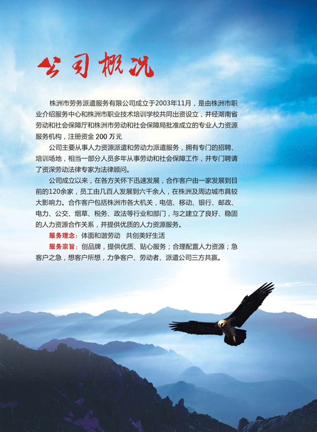 服務(wù)宗旨:創(chuàng)品牌,提供優(yōu)質(zhì)、貼心服務(wù);合理配置人力資源;急客戶之急,想客戶所想,力爭(zhēng)客戶、勞動(dòng)者、派遣公司三方共贏。